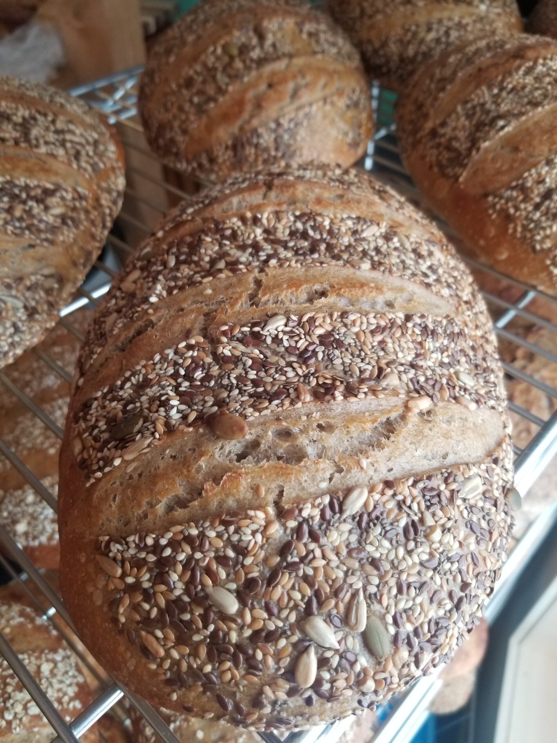 Ingrédients : Farine blanche non blanchie, farine de blé intégrale, eau, levain, mélange multigrains (lin brun, lin doré, tournesol, chia, sésame, graines de citrouille), sel.