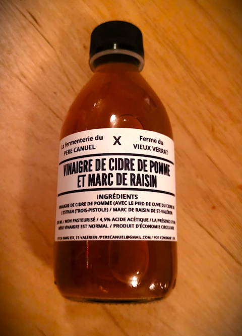 Bouteille de 250mL de vinaigre de cidre de pomme et marc de raisin (consigne de 1.50$ incluse).